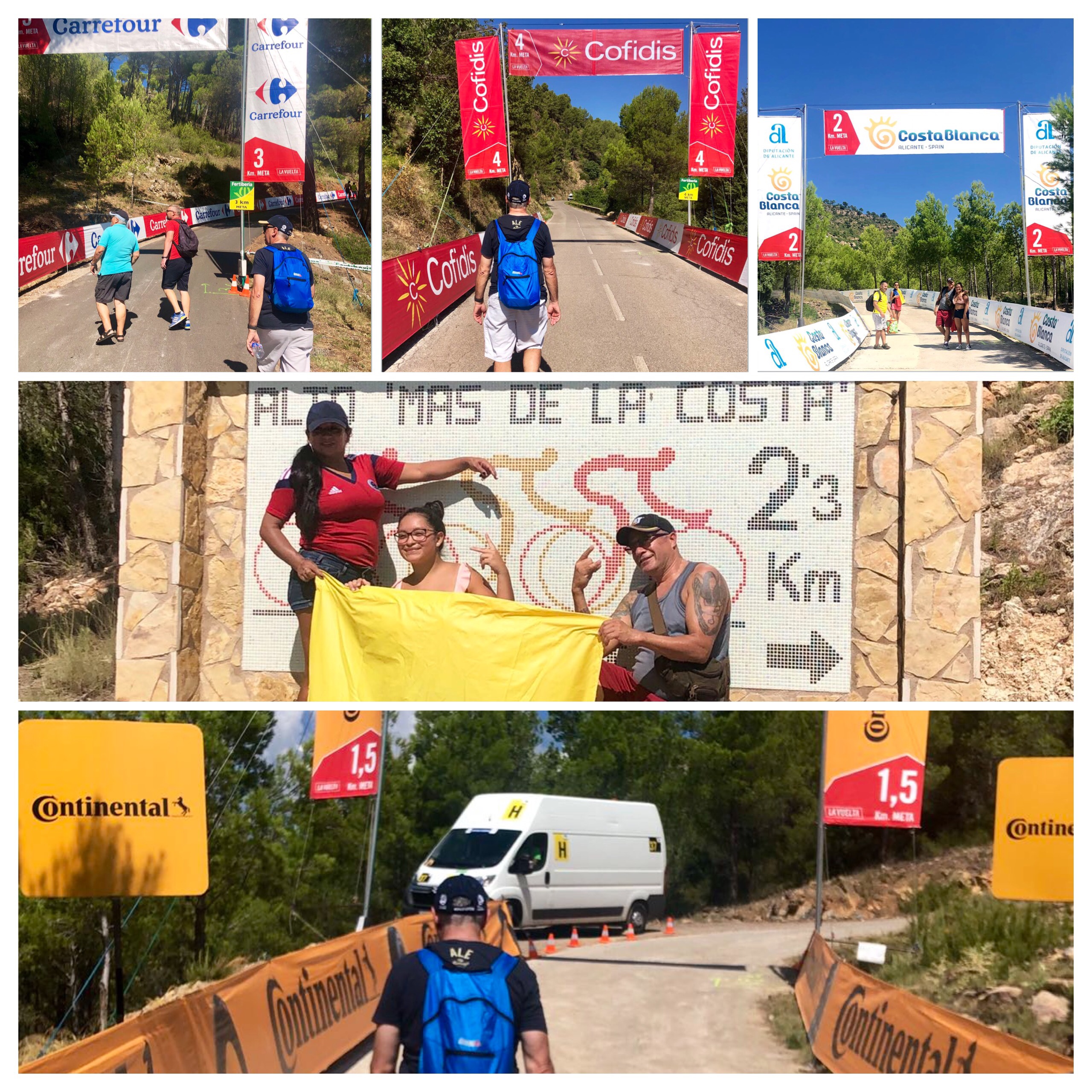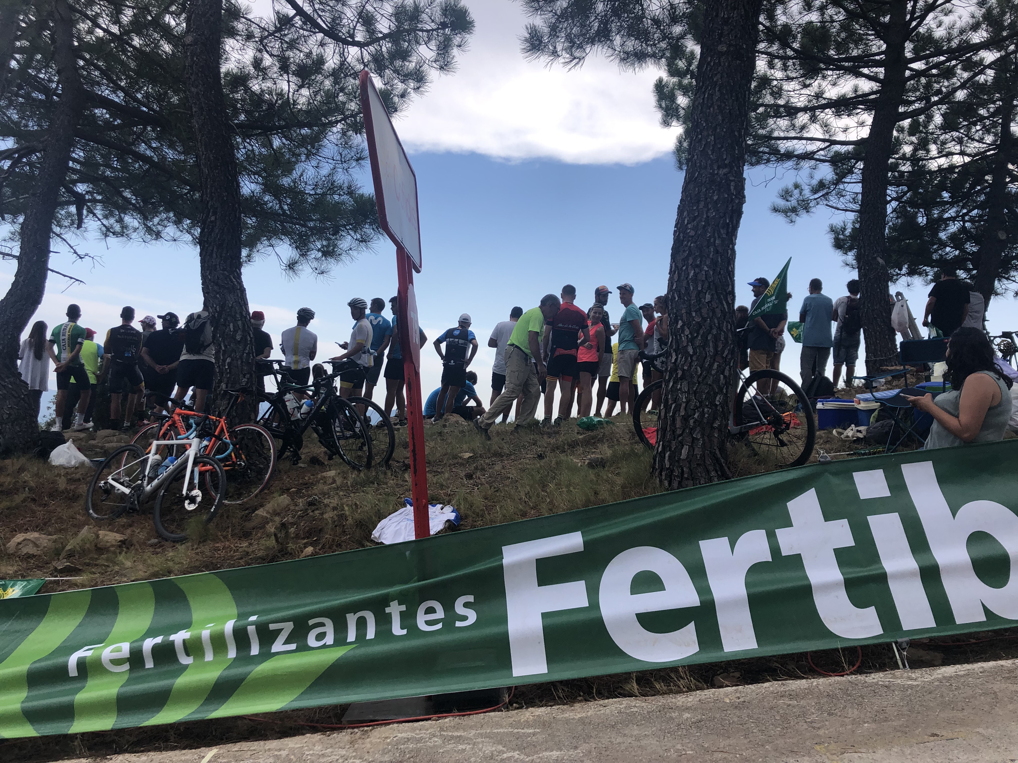 Around the 2 km mark, I was done!! It was hard, hot work. Even the young, fit kids were struggling. We rested in the shade looking rather the worse for wear, contemplating if I wanted to take even one more step, when we heard some Aussie accents approaching. We said hello and much to our delight we had a five minute chat with Matthew Keenan and David McKenzie of SBS Cycling commentary fame. They were fantastic, asking us where we were from and answering all our questions regarding the standings in the Veulta. They gave us insight into what might/ would probably happen today and told us we had picked the best day to come. They said they always walk the last few kilometres on mountain stages to give them greater understanding of what the cyclist were dealing with. With that they strode off up the 25 degree incline like only very fit young men can do. Needless to say we didn’t see them again. ( Nor did I ask for a photo. Big regret!!)
