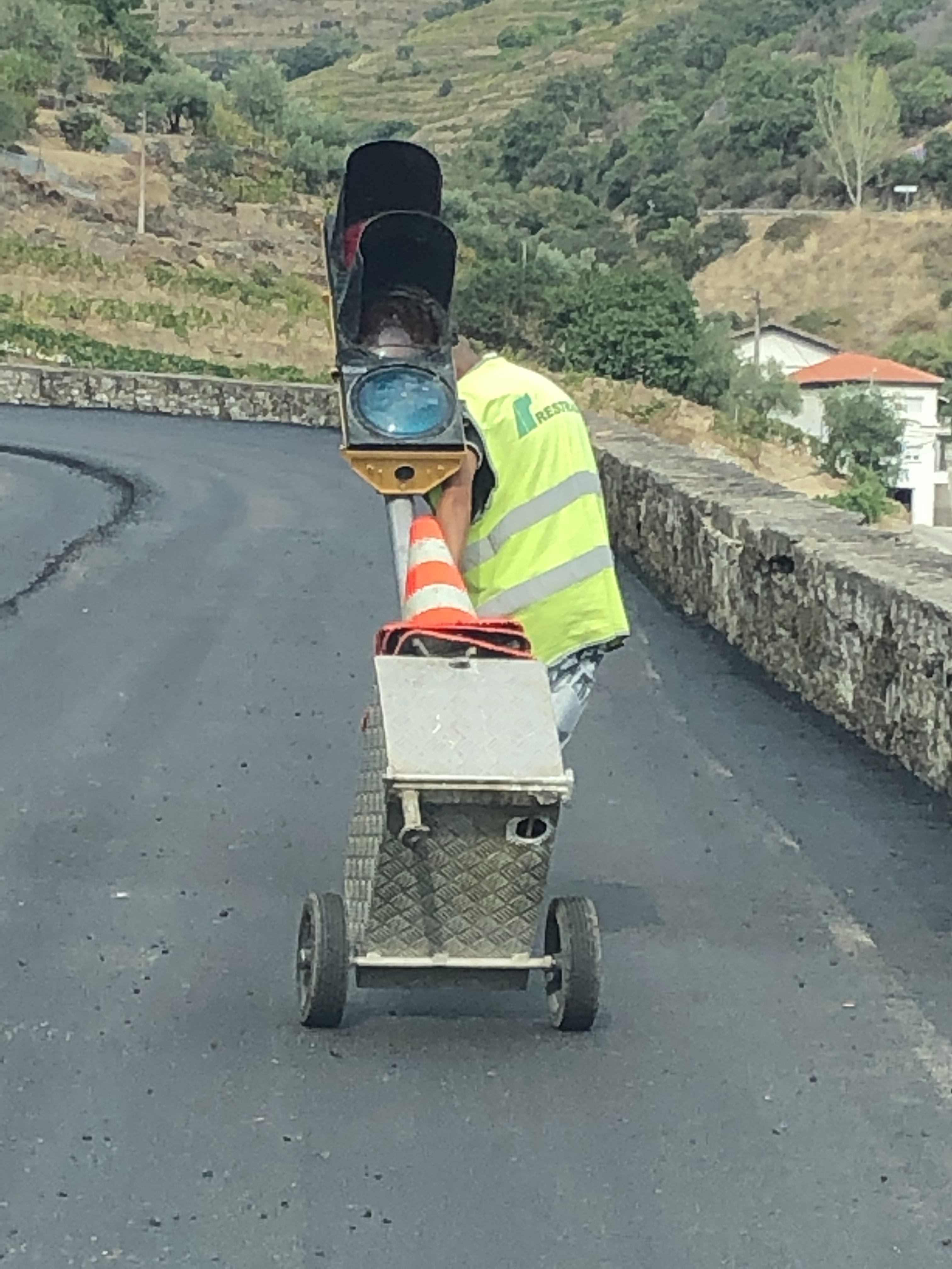 We had a little giggle when we came across some roadworks. The light was red, so we stopped. A road worker came along, and started dragging the light up the road. Do we stay where we had stopped, or do we follow the red light up the road? We chose the latter, as the poor bloke carted his heavy load up hill.