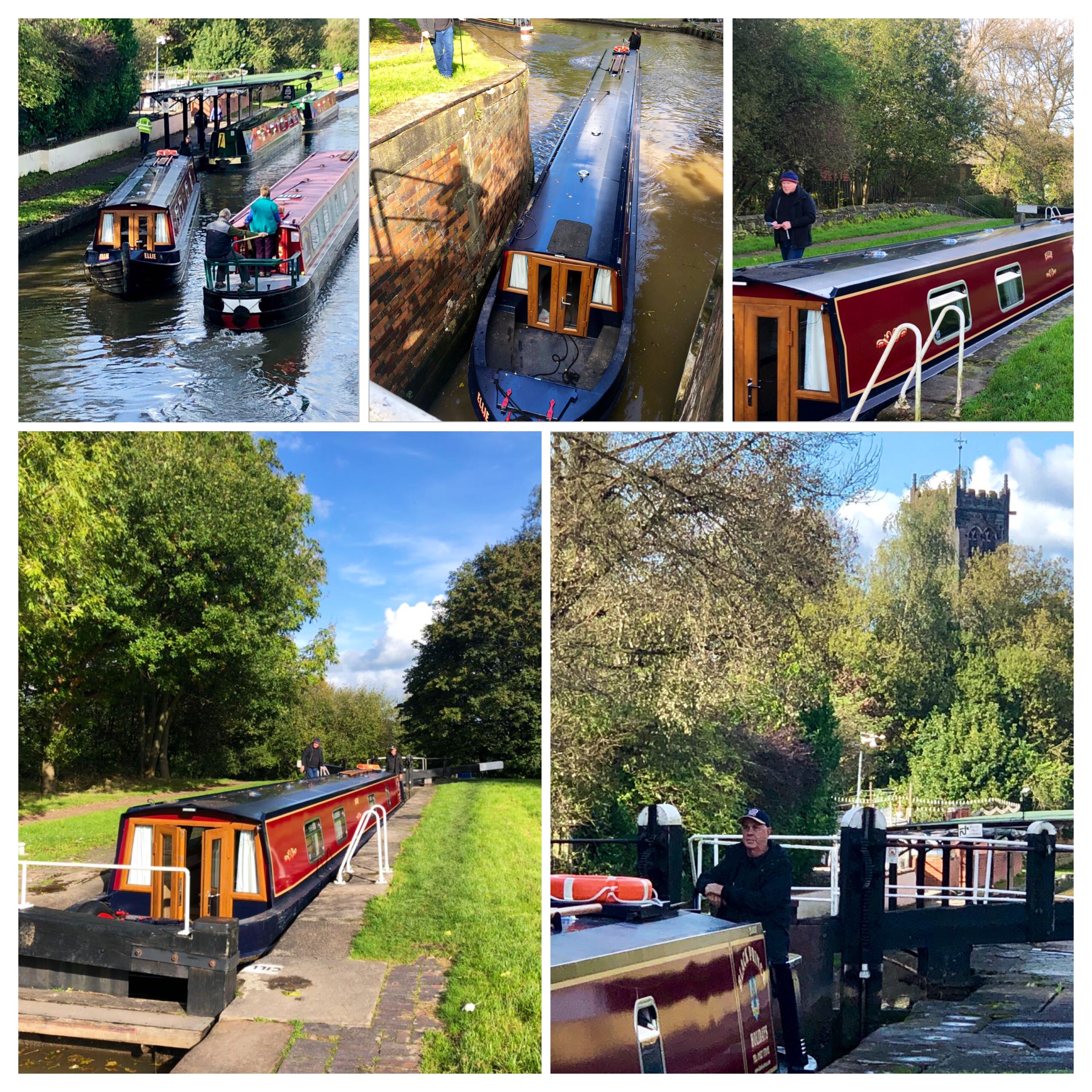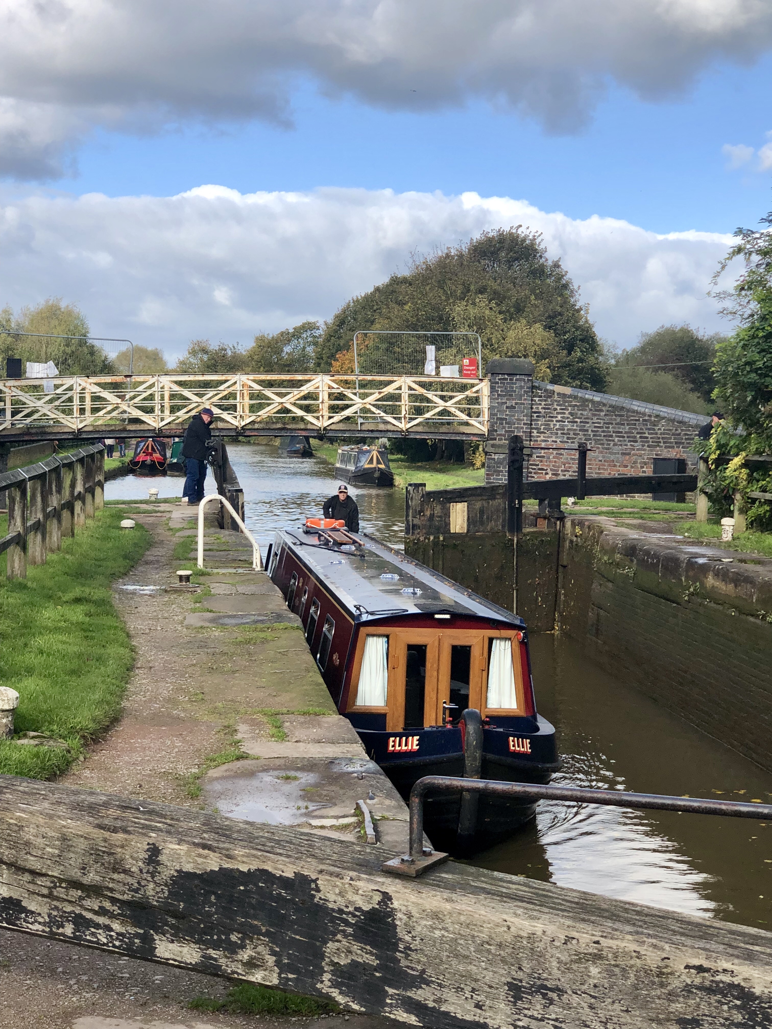 The poor lock volunteer (they have them on some tricky locks) was running back and forth between all three making sure everyone got where they were going without mishap. We had another passing manoeuvre but this time it was in the pond between locks. The wind played a bit of havoc on the turn and it took a fair bit of skill to bring Ellie around. Well done Grahame.