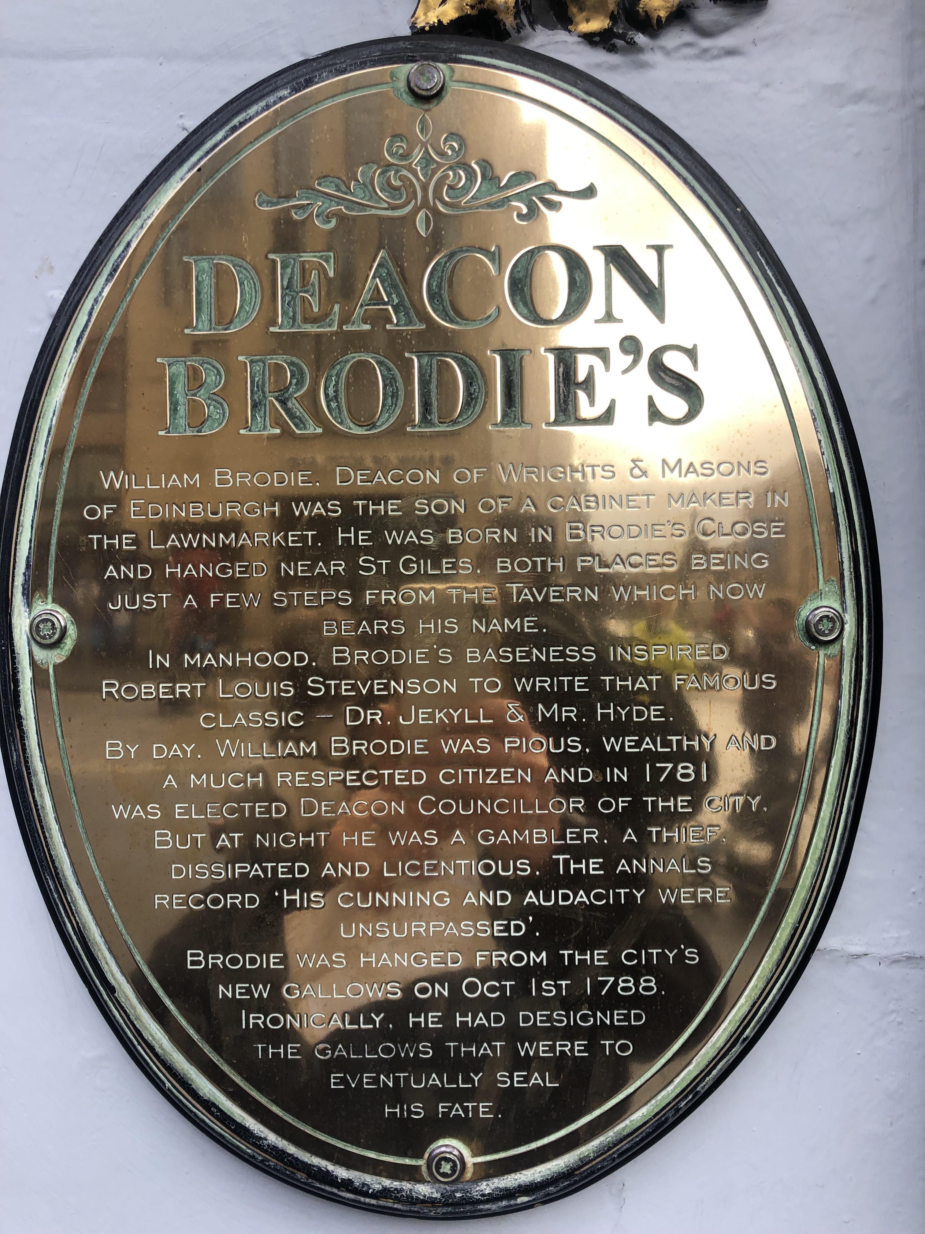 Brodie was a Scottish cabinet-maker, deacon of a trades guild, and Edinburgh city councillor, who maintained a secret life as a housebreaker, partly for the thrill, and partly to fund his gambling. When he was eventually caught and hung, it is said that the gallows were of his design and he was the first to test them out. Oh the irony!! Fact or fiction???