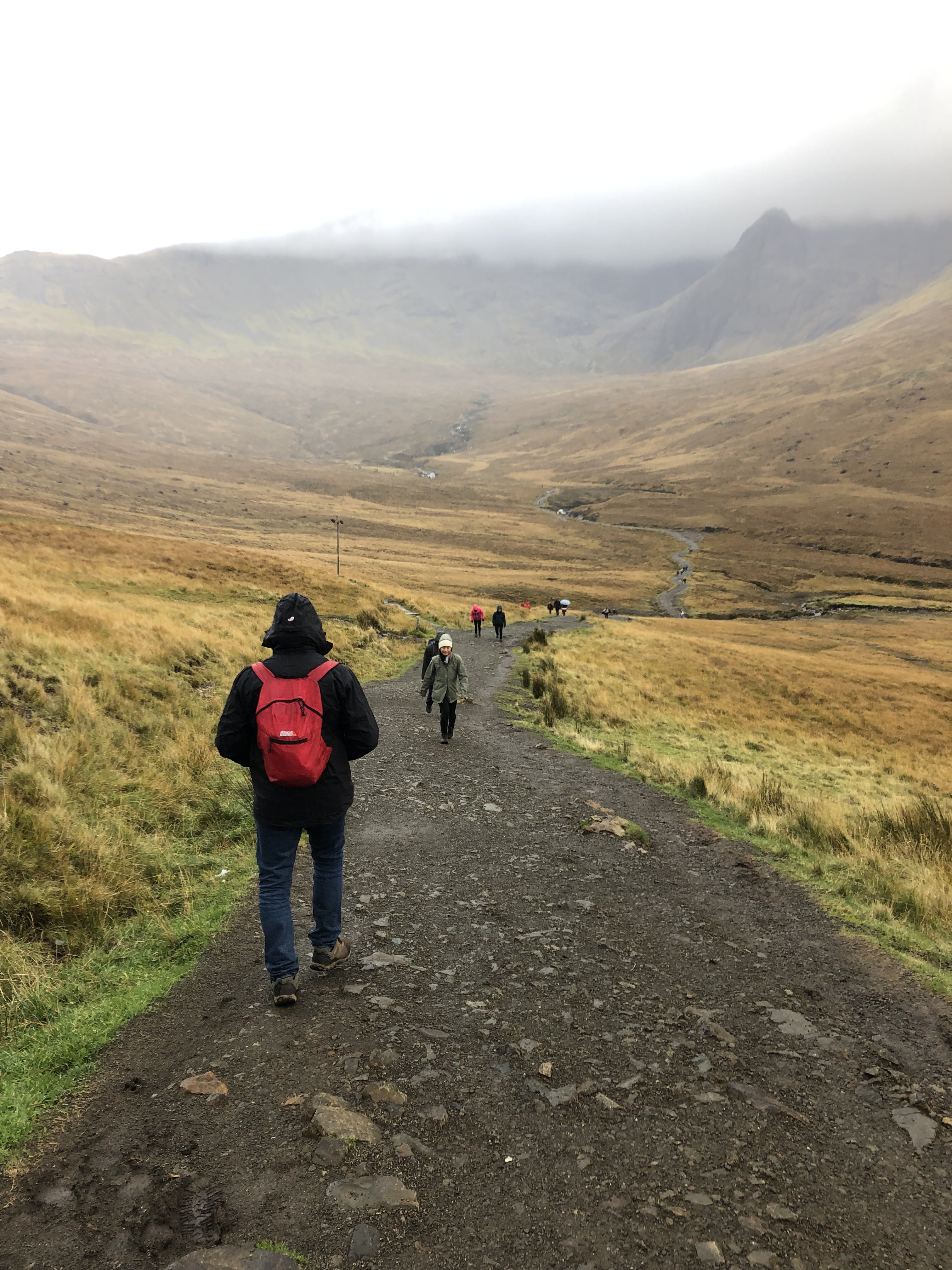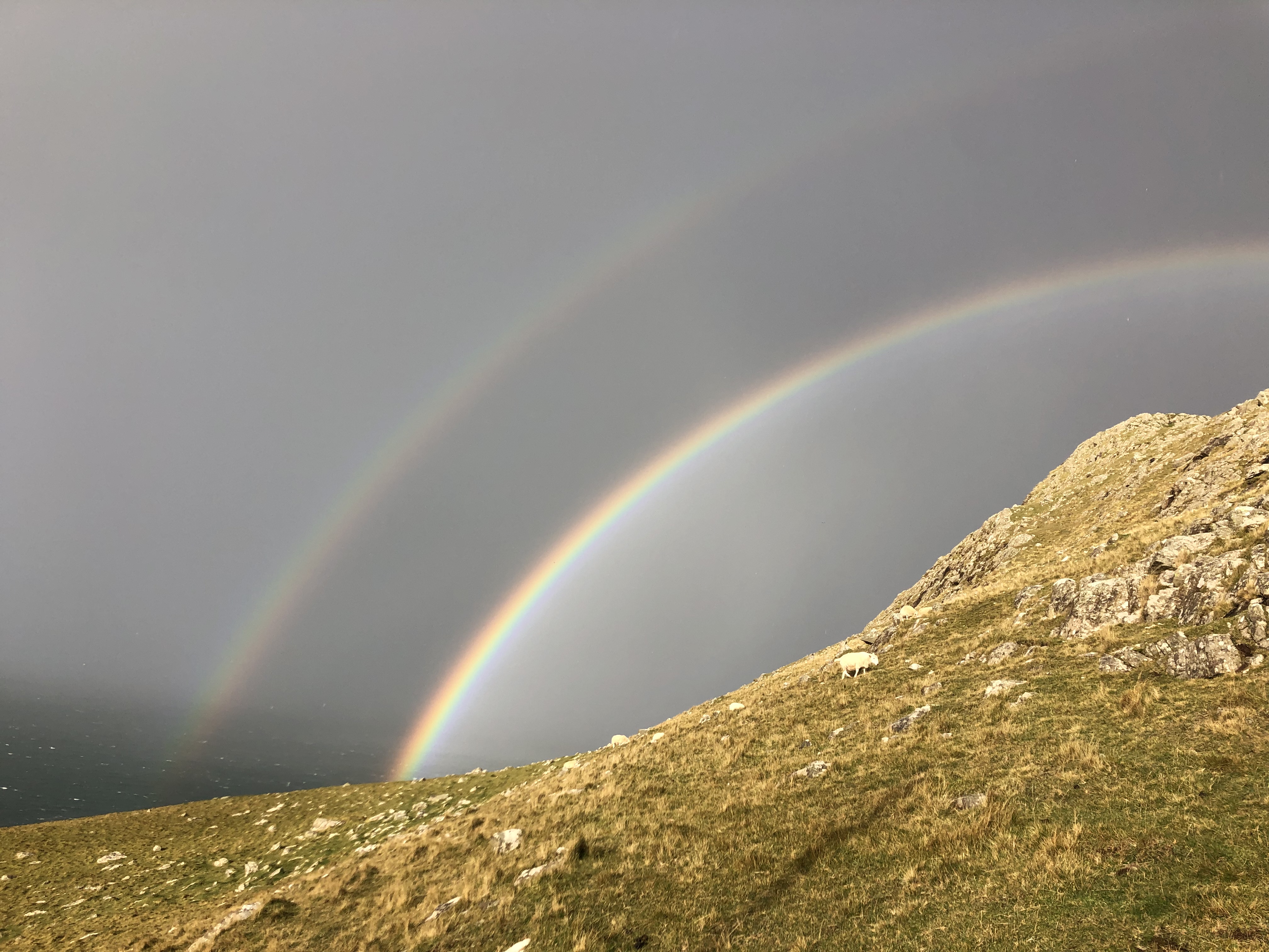 And then the rainbow disappeared! We got hit by Scotland’s infamous sideways rain, or tiny sidewise hail in this case. We got smashed on our right side while our left side stayed dry. Having tiny pellets of hail fired into one side of my face was one experience I could do without!!