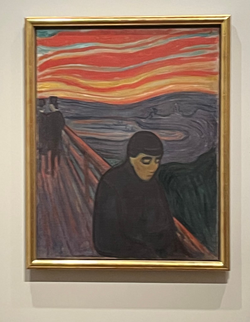 According to Google „Munch recalled that he had been out for a walk at sunset when suddenly the setting sun’s light turned the clouds “a blood red“ He sensed an “infinite scream passing through nature”.