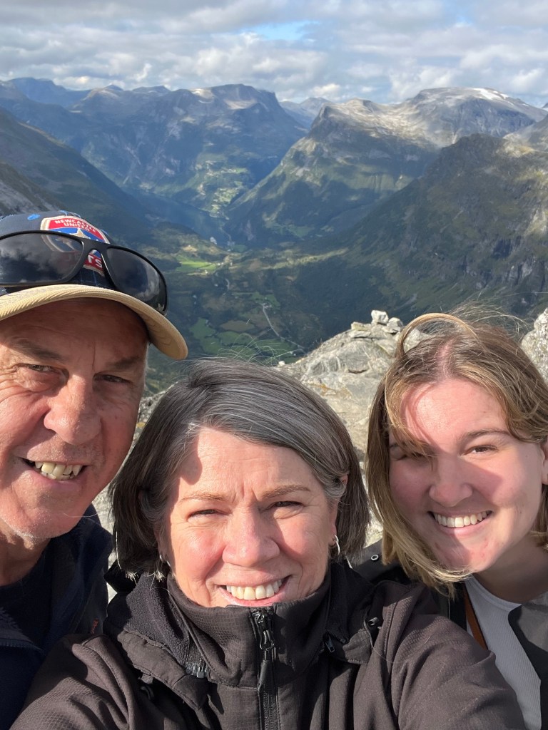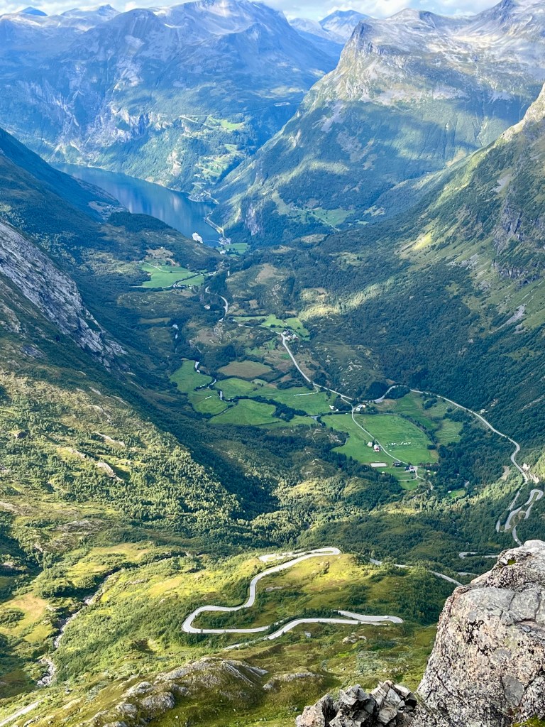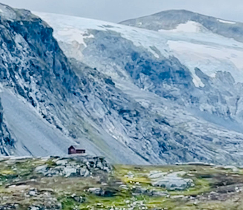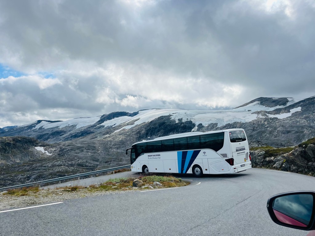 We paid an entry fee for the last five kilometres up to Dalsnibba. Not sure how much we paid because I still haven’t worked out the conversion rate, but wow, it was worth it!! The hair pin bends were hair raising and the busses, filled with tourists, hurtling down towards us were terrifying, But Grahame coped beautifully, manoeuvring our little Peugeot safely out of harms way.