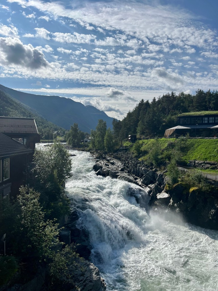 The Valley drive was gorgeous, lots of fast flowing rivers, lots of rolling hills speckled again with the little red farm houses, thickly forested mountains and, sadly, some washed out roads (which were already well under repair, and with well signposted alternative routes). About three weeks ago, Norway experienced a massive storm and serious flooding in this area. There were still some areas under water, down by the fjords, and evidence of dead trees and debris piled up, fences washed away and road damage. But overall, it all looked pretty well repaired, or at least in the process of being so.