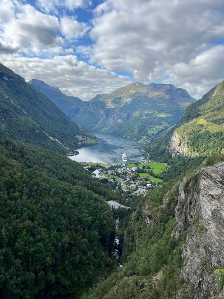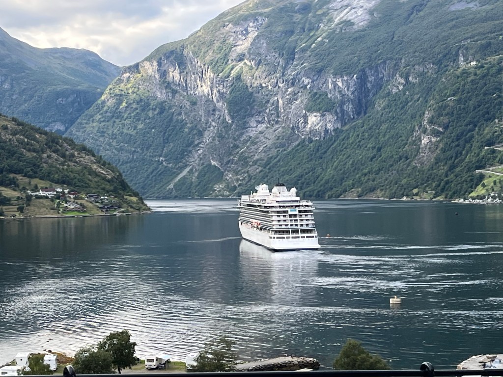 We arrived in Geiranger just in time to wave goodbye to the Cruise ship that we had spied from way up on Dalsnibba