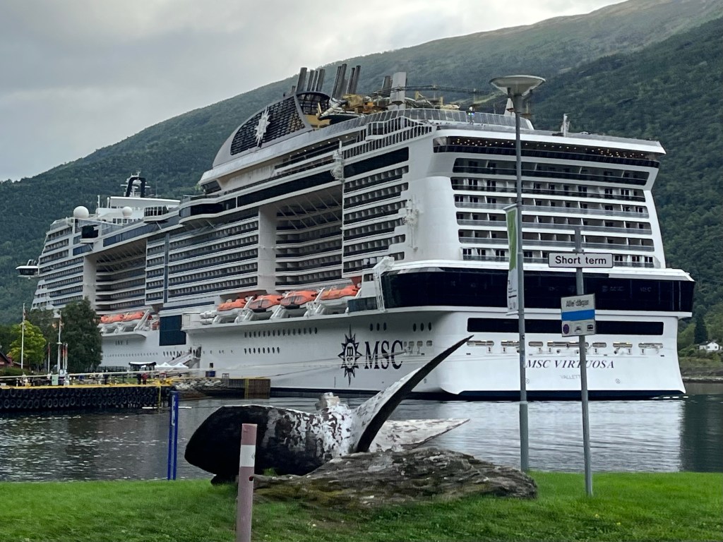 Our big Italian cruise ship from Flåm was docked nearby and the surrounding streets were filled with its passengers . We wondered whether the sick/ injured one has rejoined the ship. Hope so!