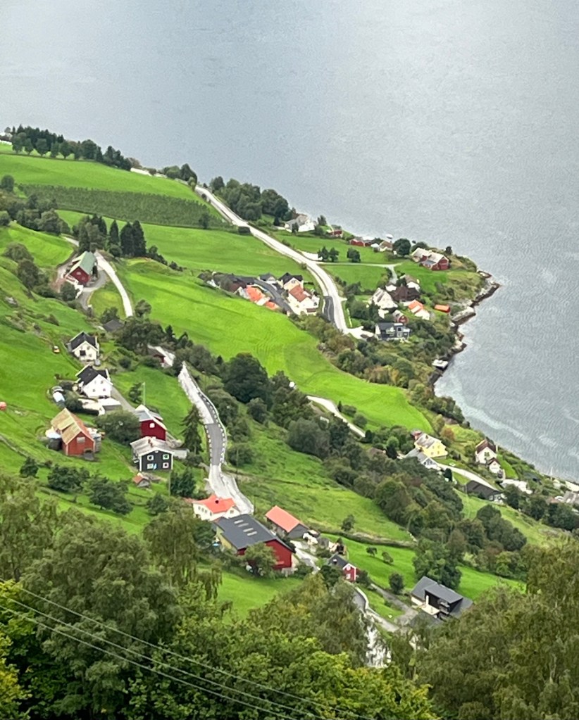 The drive along the fjord and up to this lookout was yet another adventure in narrow road driving, combined with spectacular views, hairpin bends and ….. cows.