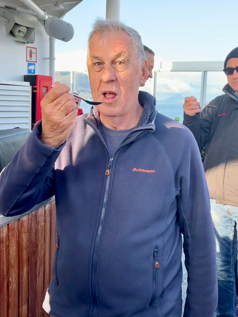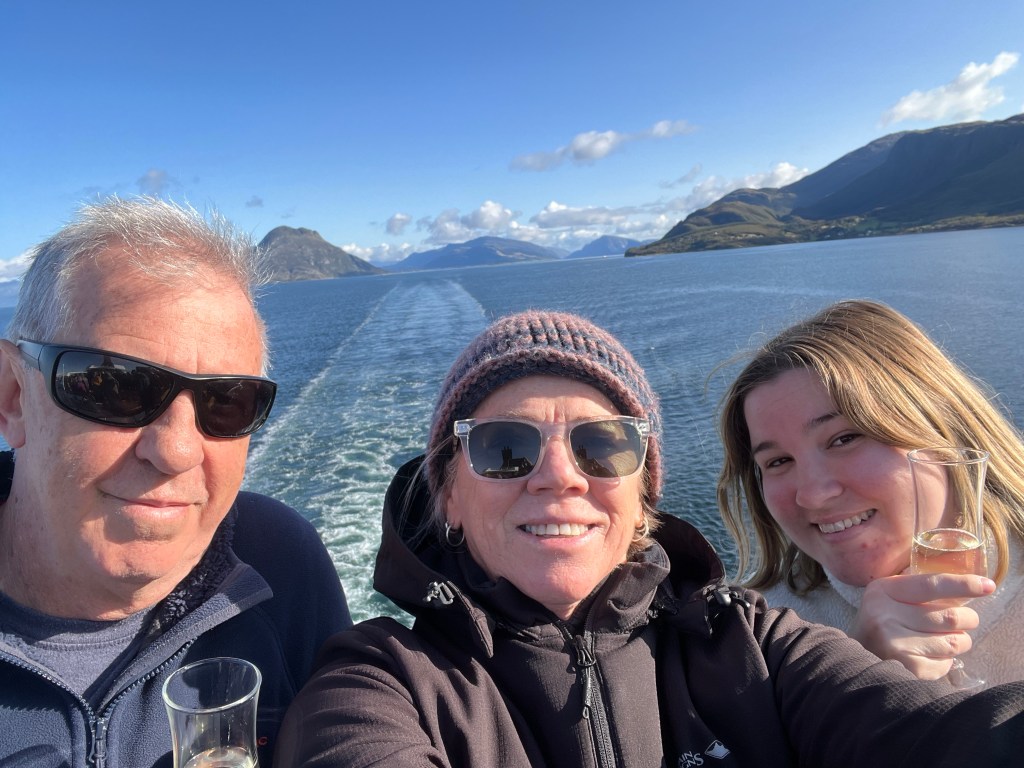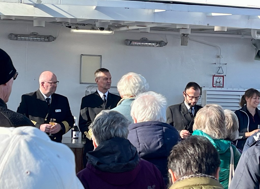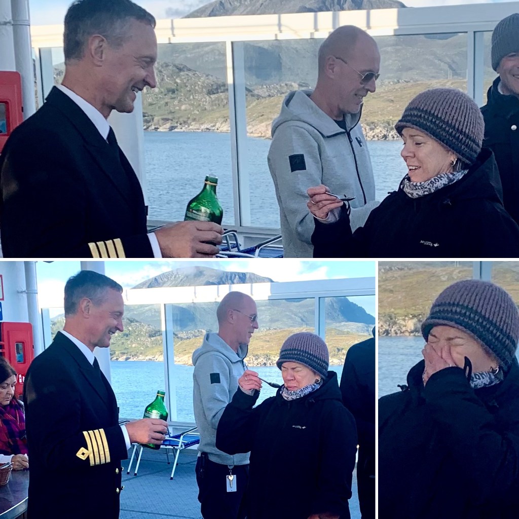 Not long after, we were summoned yet again back on deck. (It was a beautiful day weather wise, so I think the crew were taking advantage of the great conditions). This time it was to officially celebrate Hurtigruten’s 130 years sailing the route from Bergen to Kirkenes. There were speeches, thank yous and free champagne. (Could have done with that an hour earlier!)