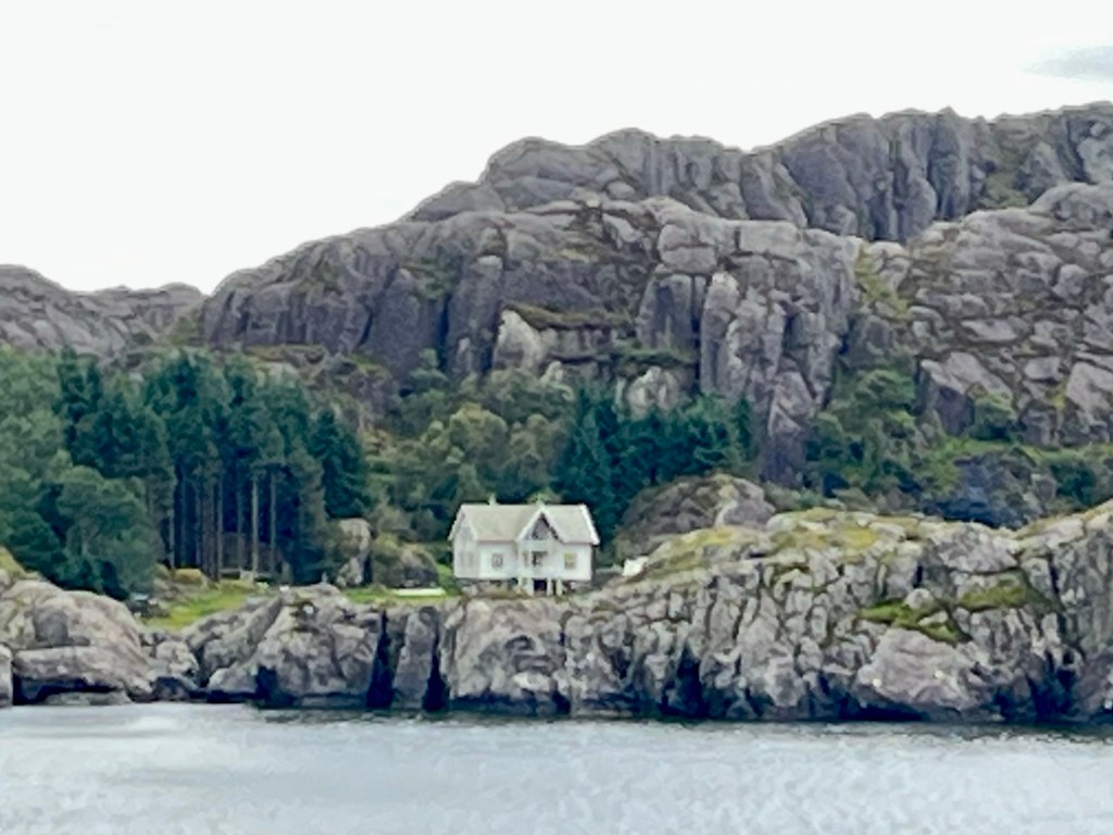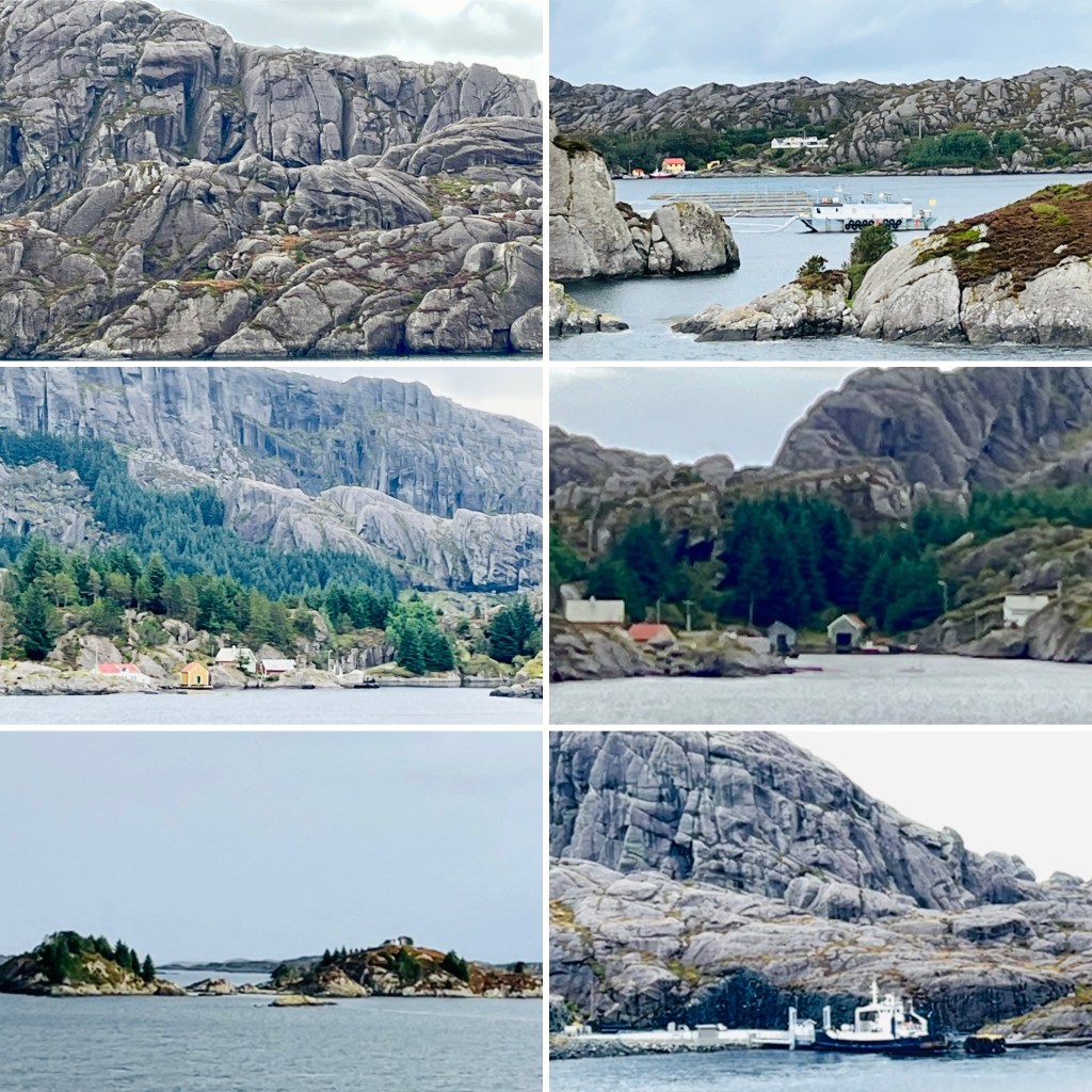 The expedition leaders called us to the deck, later when the weather had improved, to view the Stiensund. (The Strait of Rocks). Despite being less than 60 metres wide at the narrowest passage, they assured us it was shippable. There were little houses hidden in little coves, salmon farms and rocky islands everywhere.