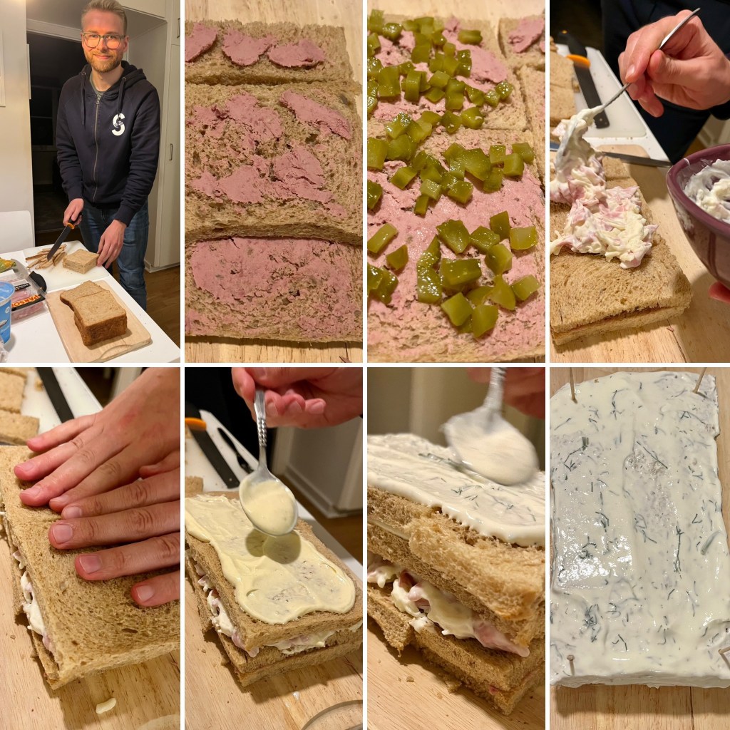 8 slices of toast bread with crust removed. 1: Spread Liver Pâté over the first layer of bread and sprinkle on chopped pickled gherkins, 2: Add another layer of bread with more pâté on the underside and a mixture of Creme fraiche , chopped ham , grated apple and a pinch of salt on top, 3: Place another layer of bread, this time time topped with Creme fraiche mixed with curry and another pinch of salt, 4: Final layer of bread 5: Coat the whole “cake” in a mixture of Creme fraiche , sour cream and dill.