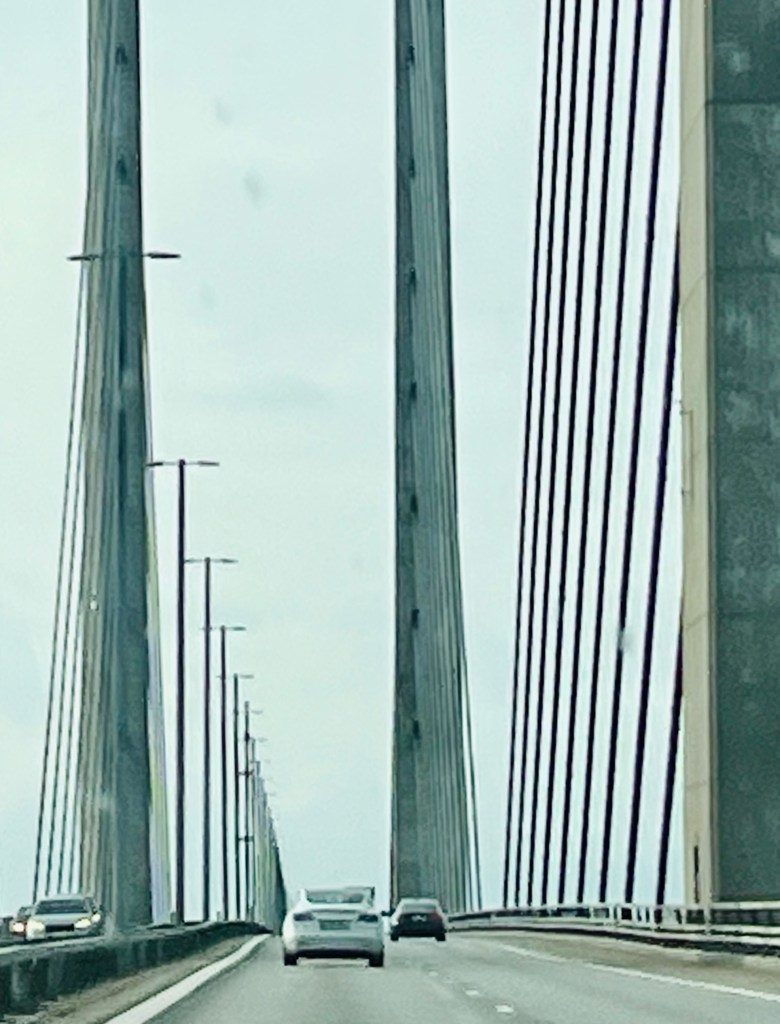 The crossing consists of 8 km of bridge from the Swedish side to a small manmade island in the middle of the strait , followed by 4 km of tunnel before arriving on the edge of Copenhagen. Gustav coped brilliantly with the traffic and managed to block out all the fuss we were making as we crossed the border.