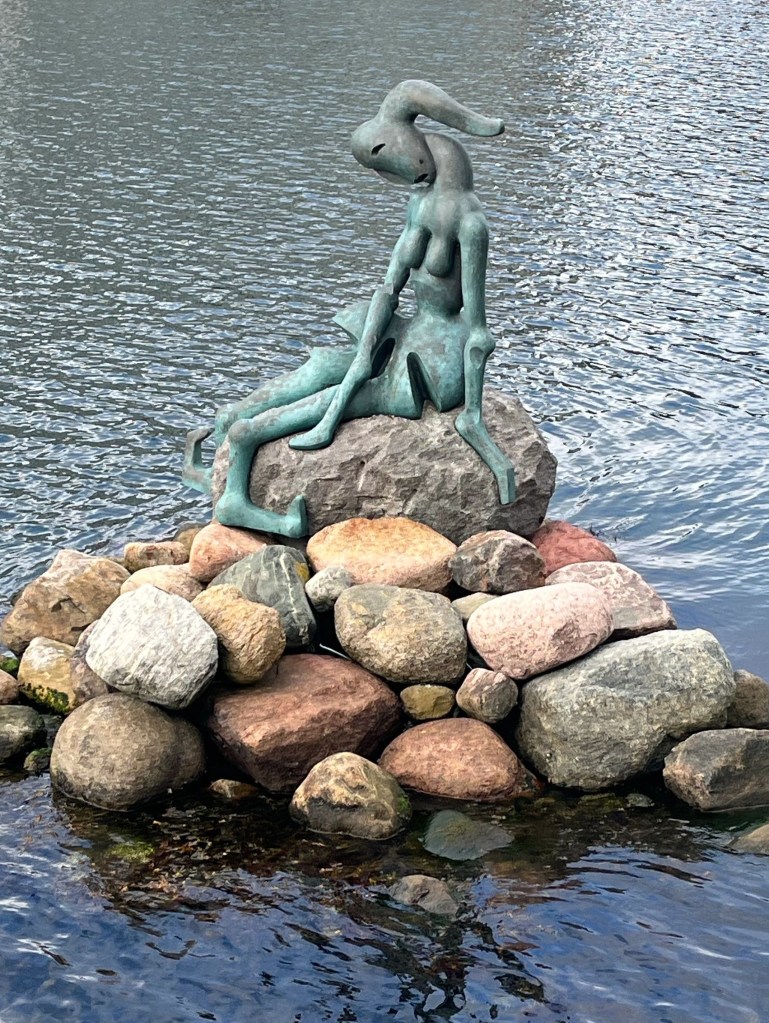 Gustav thought we needed to explore further along the canal in order to find another little statue…. The Genetically Modified Little Mermaid. We found her too, and I really liked her. Unlike the crowds at Hans Christian Andersons’ version, we had this one all to ourselves.