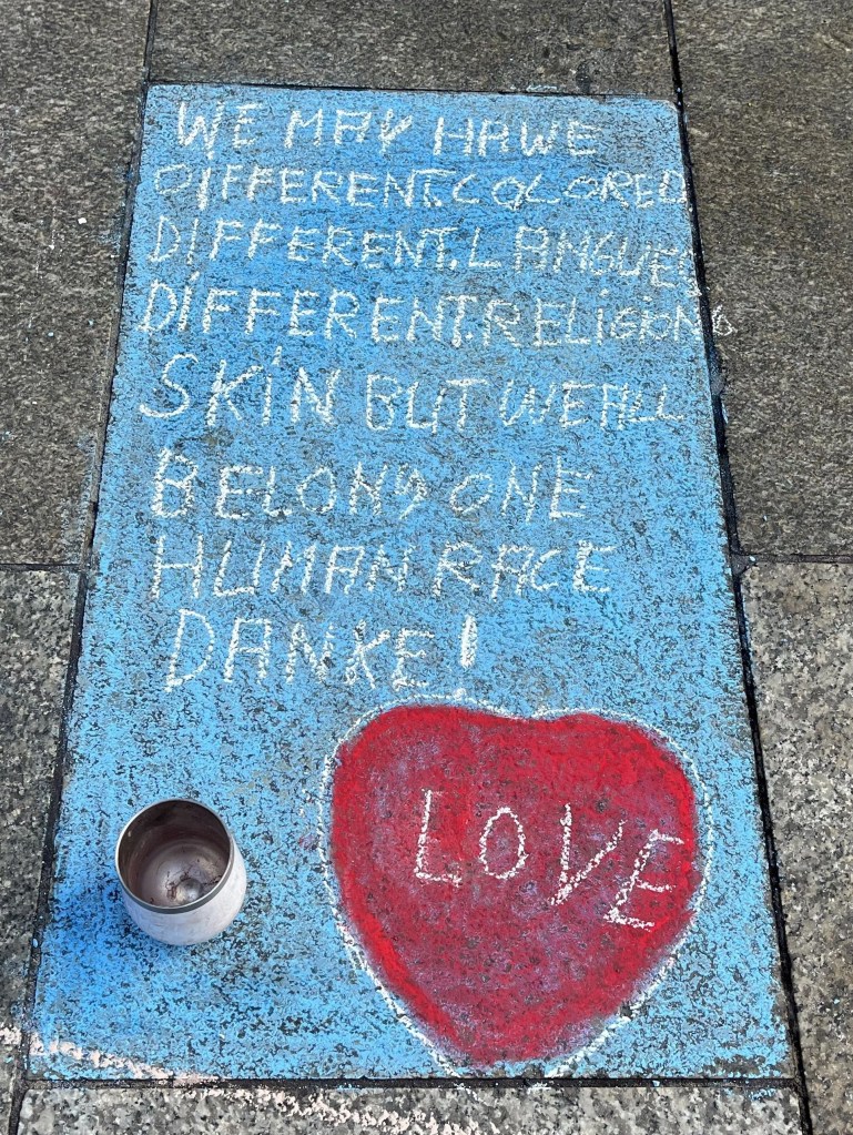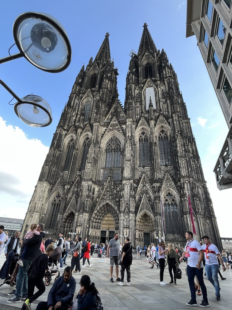 Just around the corner, we were back at the Cathedral. By now the kids running event was finishing up, the protesters/demonstrators were ramping up, the chalk artists had completed their drawings, the tour groups on segways, bicycles and on foot were gathering, local Cologne and Stuttgart Football fans were milling prior to the game. It was hectic.