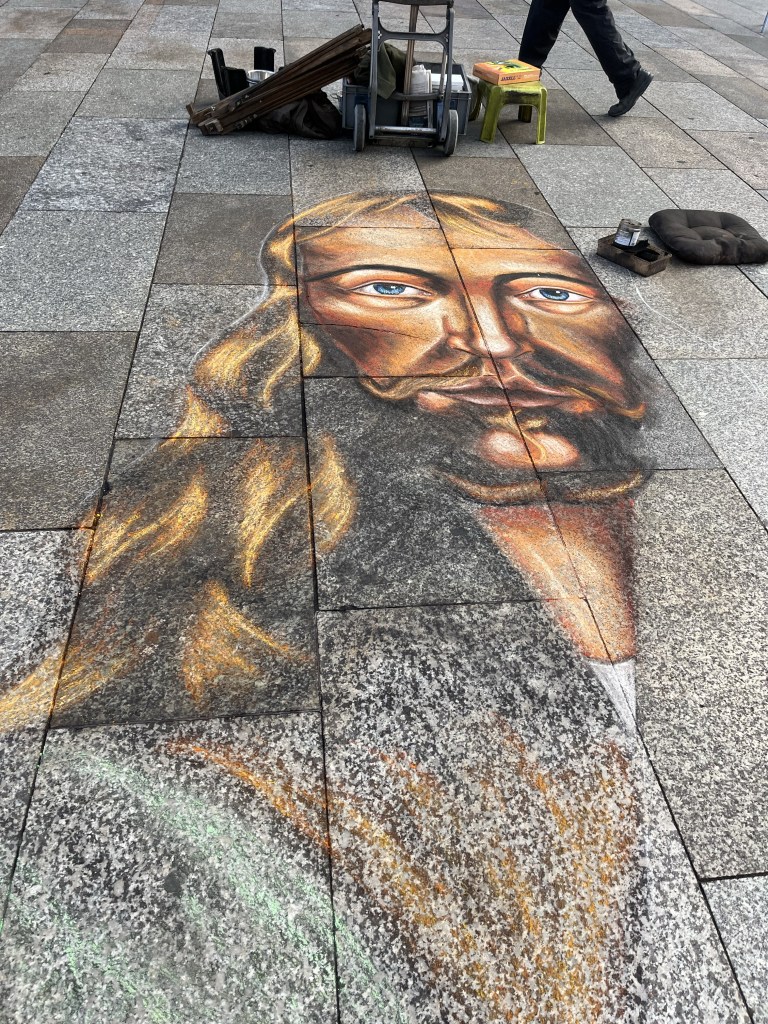 The chalk artists were busy recreating their works on the Cathedral forecourt. After last nights r#*n, yesterdays art had been washed away.