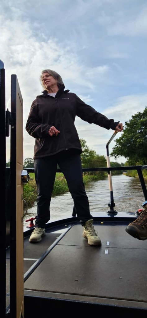 Given there were no locks to negotiate, and the Captain seated along side, it was the ideal time to “Point at Problems”. Tiller in hand , I pointed at overhanging trees and overgrown bushes, I pointed at moored canal boats, I pointed at bends in the canal, I pointed at narrow, narrow sections in order to pass under little bridges. And mostly, it worked. It was reassuring to have John sitting calmly beside me, at the ready if things went belly up. What I discovered was that I was ok at pointing at one problem, but when they grouped together and became more that one problem all at once, things could get tricky. For example, an approaching canal boat on a corner, with an overhanging tree , and a “slow to withdraw his fishing rod“ fisherman, sent me into a bit of a tiz. Which problem should I point at? The obvious answer was.. ME, and I’d quickly hand the tiller back to John to rescue the situation. Anyway, the upshot of lesson one is that I’ve been awarded a “Provisional Tiller License” (PTL) and may be allowed to have another lesson tomorrow.