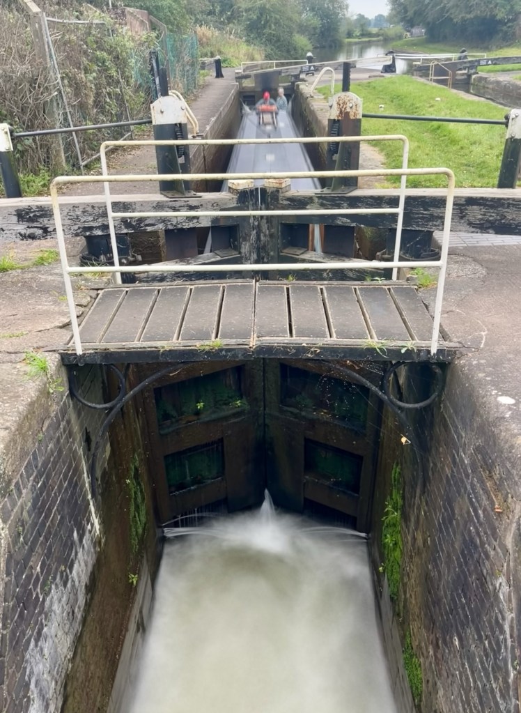 Due to the lock closure there was quite a bottle neck of boats, probably filled with travellers having to make the same decision as us. Some were willing to wait it out and others like us, were looking to keep moving. As a result we had to join a queue to descend these last three locks. There was also a queue of boats wanting to come up the remaining three locks (something we hadn’t had to deal with all day). This meant one boat down, one boat up, one boat down, one boat up etc. It was a long slow process. To add to the time delay, was the fact that these locks were situated on a sharp corner with lots of trees making it was difficult to see what was happening further down. We had to rely on those down around the corner to pass messages on up the line and vice versa. To summarise…. It was mayhem.
