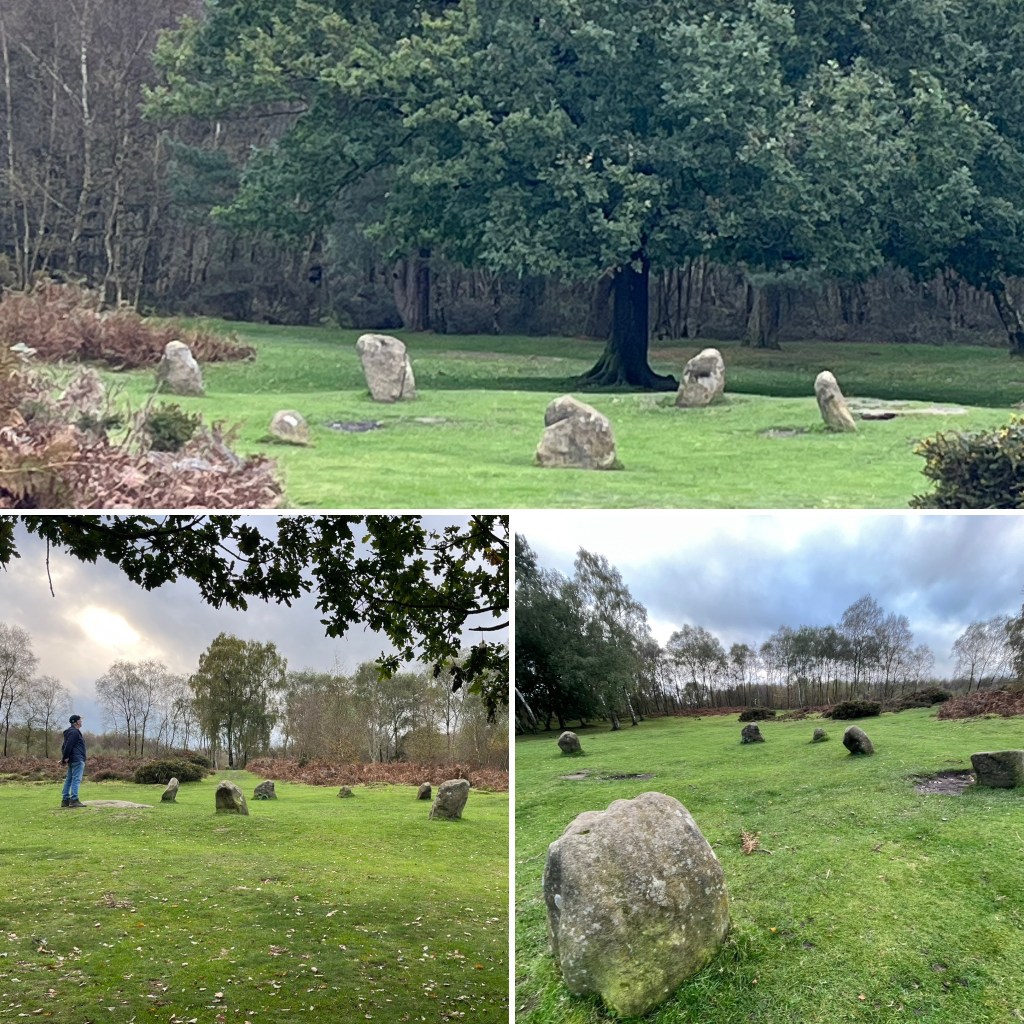 The music was played by a fiddler, who became the King Stone, which stands around 30 metres south west of the circle. The name carved into this stone, Bill Stumps, is also mentioned in The Pickwick Papers by Charles Dickens.” ( from info boards at site)