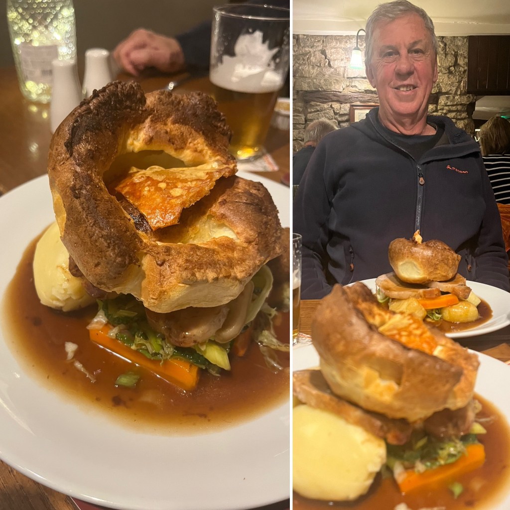 We parked “Baby Blue” at our Airbnb and walked to our local, “The Red Lion”. We hadn’t made a booking but we were hoping to get some dinner. Sadly there was “ No room at the Inn”. It didn’t matter, we had some provisions at home. Just as we were about to head home , the Publican, who we had met the night before, came and whispered to us, that they could now fit us in and had already set the table for us. Bingo!! Sunday Roast with Yorkshire Pud. (Much better than cheese and chips.)