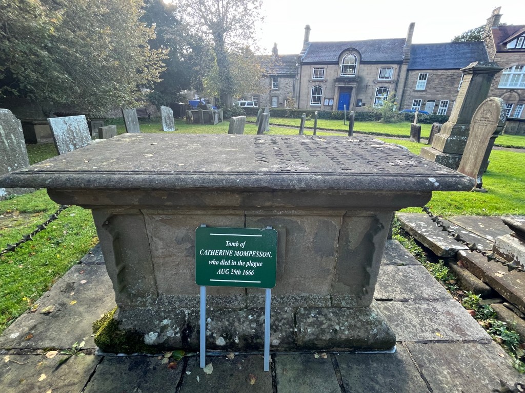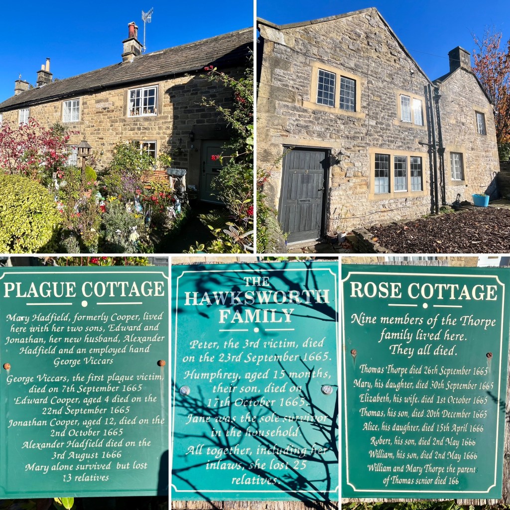 We walked past the “Plague Cottages”, 3 little stone cottages at the epicentre of the outbreak. The green plaques outside telling the sad story. (There are many of these plaques, sadly, to be found throughout the village).