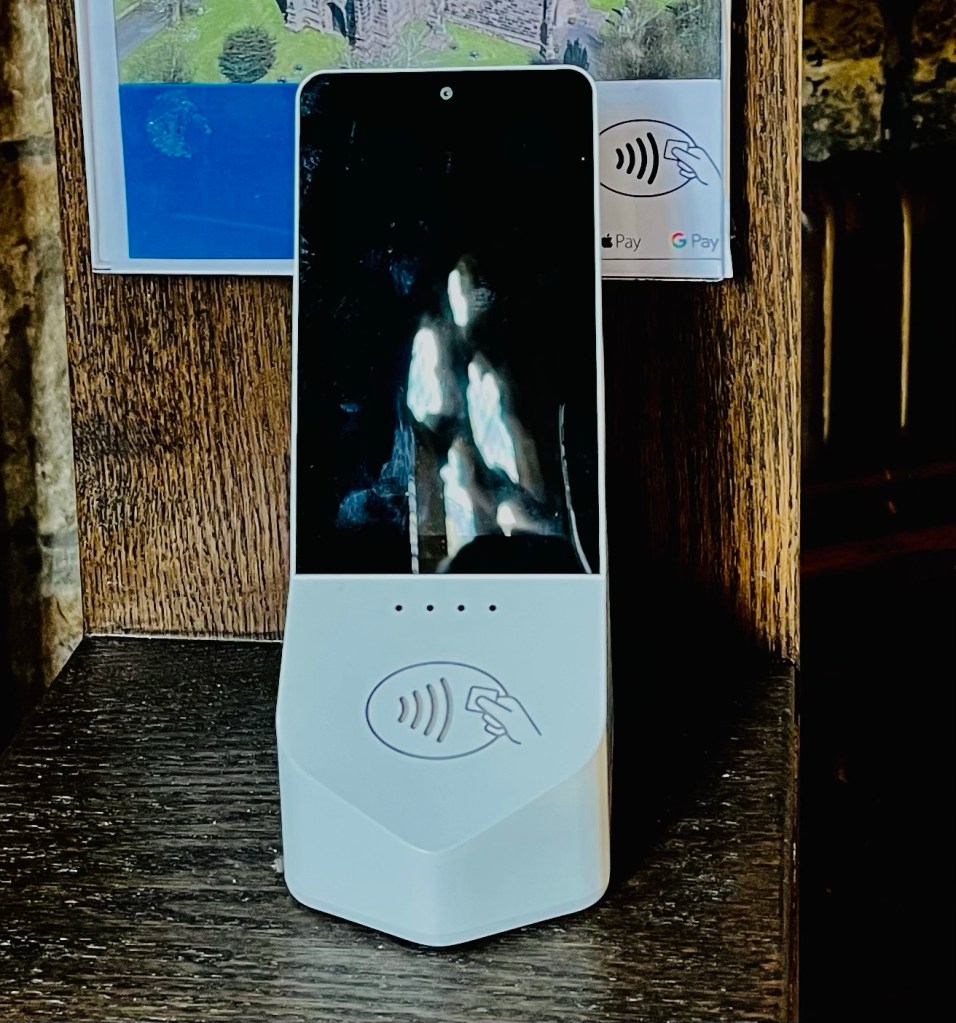 The church has gone all 21st Century with its fundraising. Gone is the donation box. It’s all electronic now. Pay wave away your Pounds!