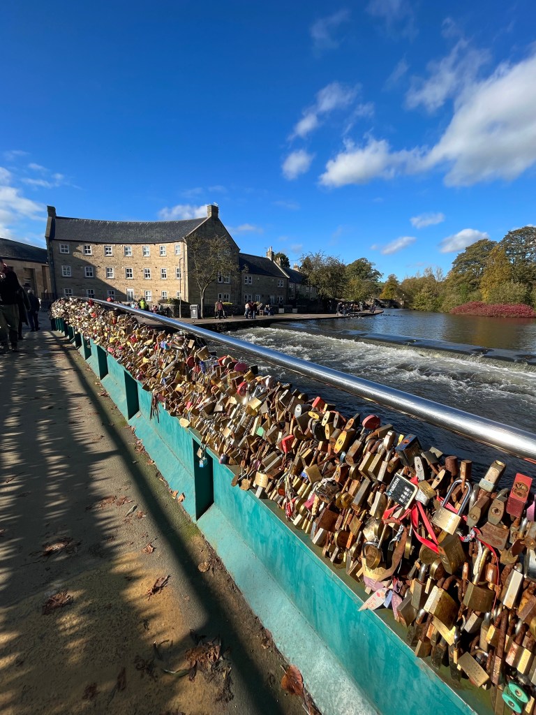 We crossed the lovely old grade I listed stone arch bridge spanning the River Wye. The water level was still high from a few days ago. We then came across a love lock covered pedestrian bridge. Once again, we didn’t see the need.