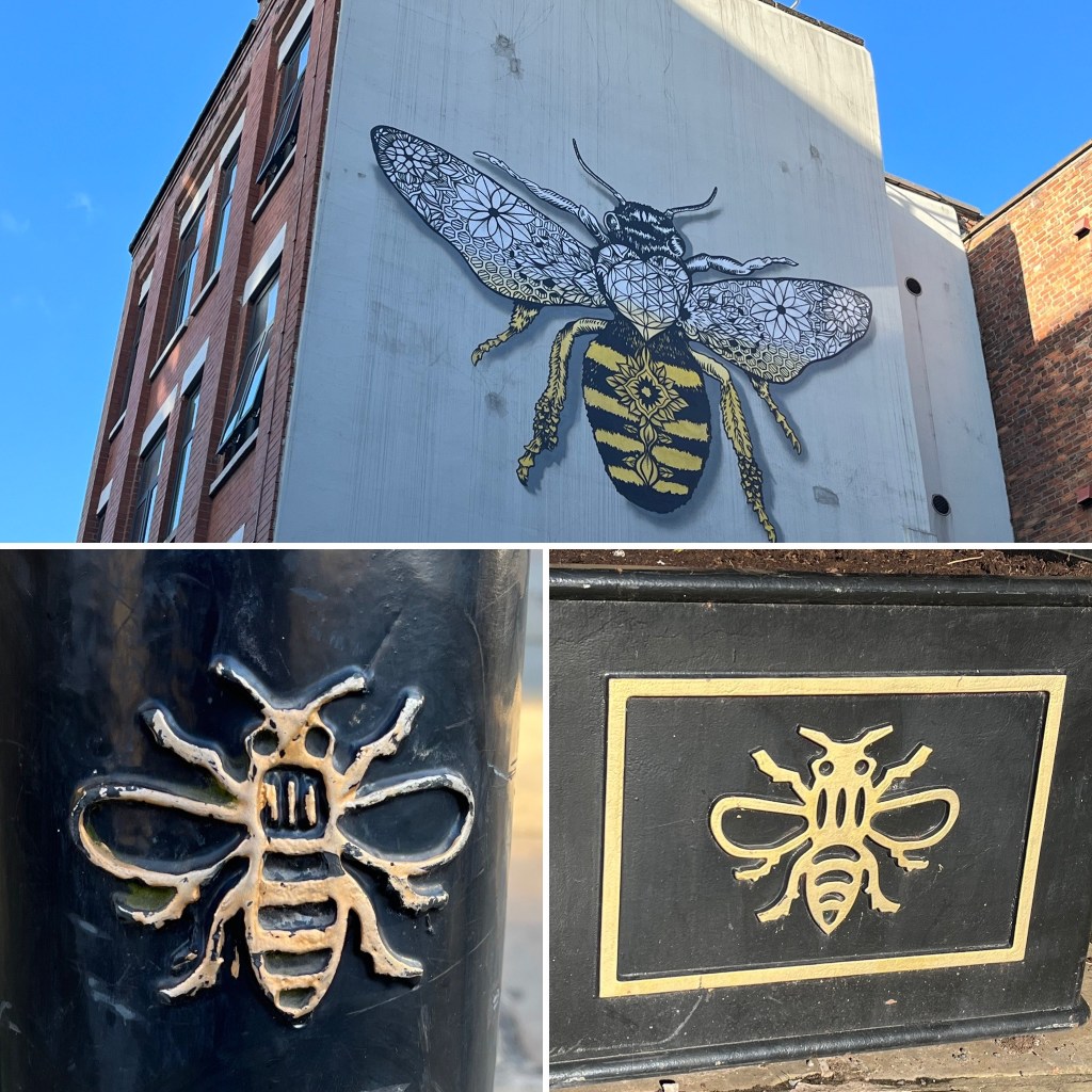 The Bee is the symbol of Manchester and it was on everything! From city street furniture and bus stops to huge murals , the bee was evident. It represents Manchester as a city of industry and hard work.