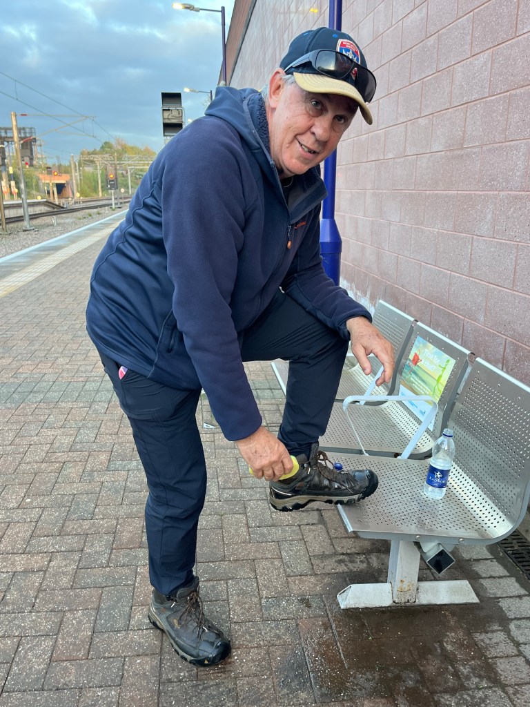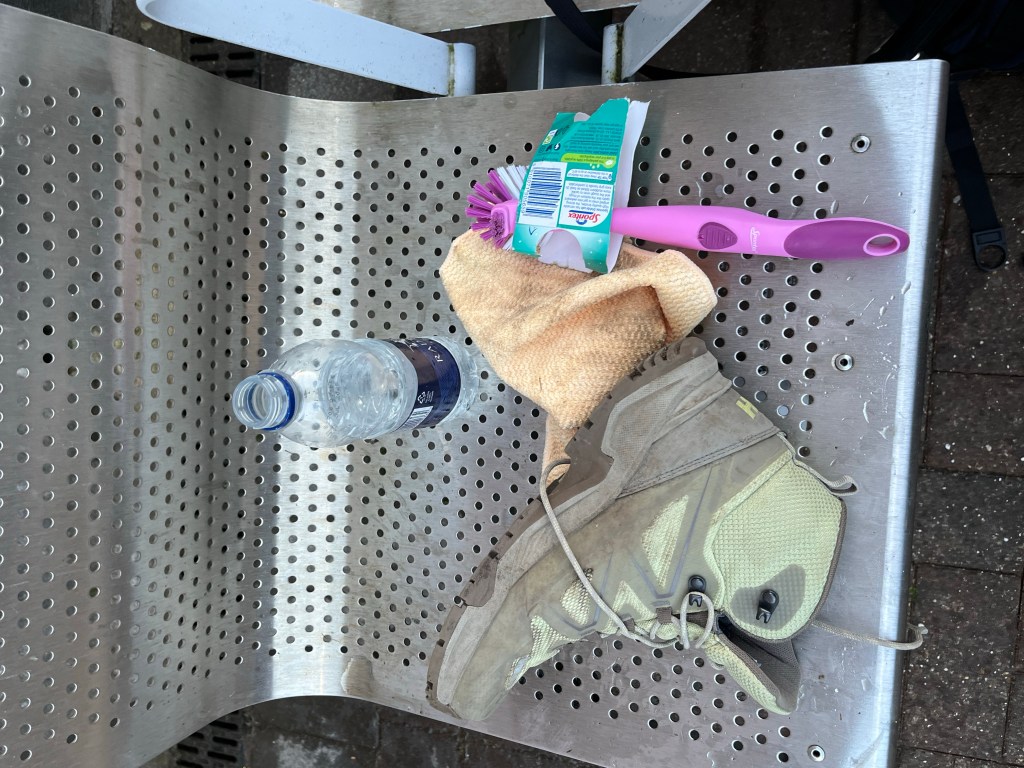 Earlier, at Tesco in Stoke, I bought a dish scrubber and some cleaning pads in order to give our boots a scrub before arriving at Australian Customs. ( I’ve been rapped over the knuckles before when arriving back in Australia with muddy boots!) I’m sure we looked a sight, on the train platform at Manchester airport busily cleaning our boots.