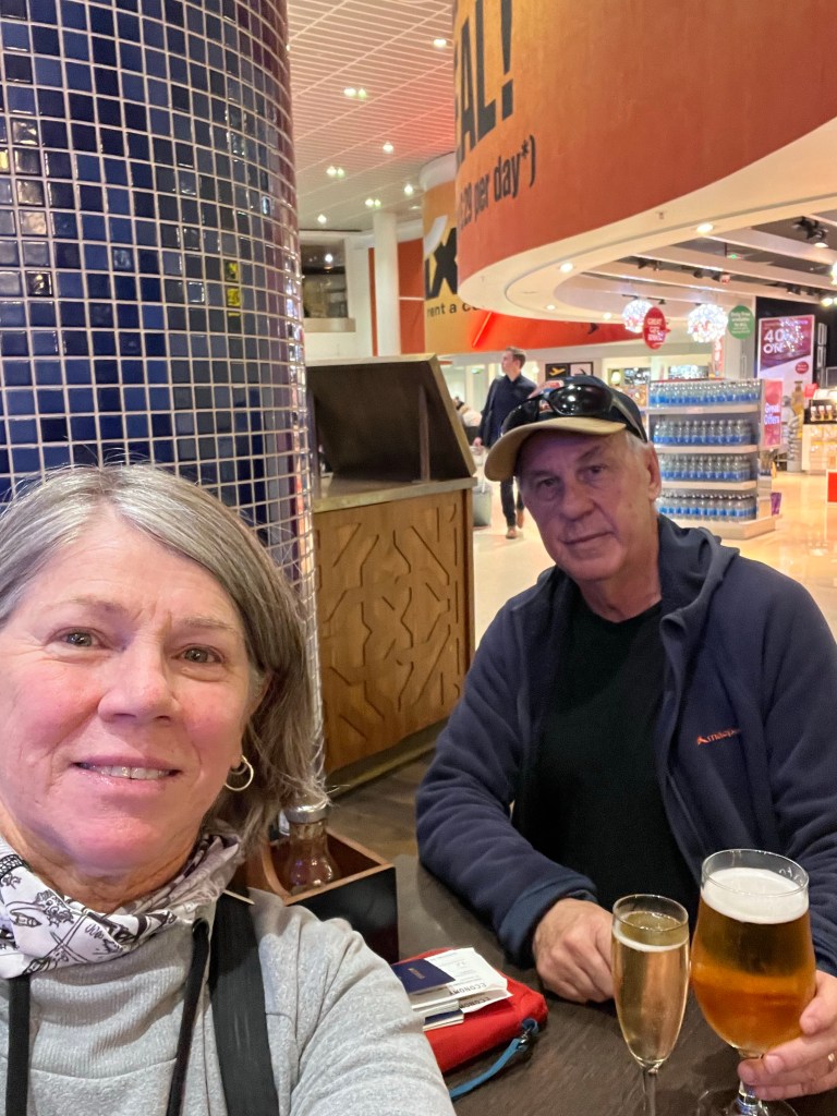 The queue to check our bags and get through customs and security was long and slow moving. It took a while and once cleared we “celebrated” the end of our holiday with a champagne or two.